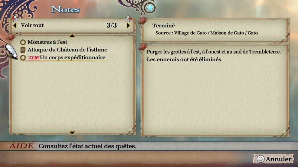 Un conseil : visitez toutes les villes et parlez à tout le monde. Recrutez les personnages et visez la complétion des requêtes. N’hésitez pas à faire durer un combat si vous le pouvez en utilisant diverses techniques et maximiser les chances d’en débloquer de nouvelles.